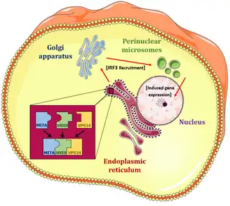 SNX8 is a key component in the induction of downstream effector antiviral gene transcription in response to DNA viruses, as it is necessary for MITA-mediated activation of the IFNβ promoter in a dose-dependent manner. It regulates the activation of MITA, a central adaptor protein in the innate immune response to DNA viral infections that activates and onsets the antiviral response, by allowing its association with the class III phosphatylinositol 3 kinase VPS34-containing translocon machinery to form the MITA-Vps34 translocation complex; this linkage is crucial for MITA transport from the ER to perinuclear microsomal punctuate structures, which are induced by infection of viruses such as HSV-1, via Golgi mediated intracellular traffic. This MITA transport pathway is vital for the immune response to start. SNX8 is suggested to play a role in MITA's activation through this transport pathway, modulating its phosphorylation at serine in position 366 and recruiting the transcription factor IRF3 whose activation is important in the activation of the IFNβ promoter transcription. This hypothesis is supported by the fact that MITA, SNX8 and VPS34 colocalize in the cytoplasm, and that SNX8 localization in ER, ER-Golgi intermediate compartment, Golgi and endosomes is similar to that of MITA. Examples of genes whose DNA virus-triggered expression is stimulated by SNX8 are IFNB1, ISG56, CXCL10 and IL6 (being IFNB1 and IL6 related to cytokine secretion).[10]