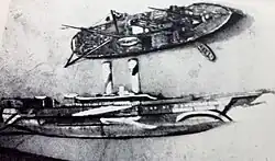 On 24 September 1918 a thermite bomb started a fire aboard Onward when she was moored alongside a pier in Folkestone Harbour. The fire took hold, and to prevent the fire spreading to the pier she was scuttled.[1] She capsized onto her port side, and later was hauled upright by a team of five steam locomotives working together.[10]