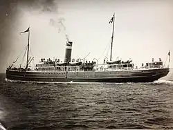 During the war Rushen Castle established what is arguably the longest modern passage between Liverpool and Douglas.[3] On Saturday 27 January 1940 she sailed for Douglas at 10:45, and was instructed by radio to make for Peel as an easterly gale had blown up and made Douglas untenable. Being wartime the message named the captain but not the ship,[4] and by mistake said "go to the West," which would have indicated Peel to Captain Bridson. The captain duly tried to get into Douglas but was then signaled to make for Peel. By the time the ship got to Peel the wind had veered and berthing at Peel was not possible. Eventually the Rushen Castle did get in at Peel - at 10:00hrs on Tuesday 30 January, after being at sea for 71 hours. The Earl of Granville, Lieutenant Governor of the Island at the time was one of the passengers.