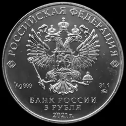 The coin was designed and sculpted by A. V. Baklanov and minted at the Saint Petersburg Mint and the Moscow Mint.[1] The 2006-2016 obverse features the emblem of the Central Bank of Russia—a double-headed eagle with wings down. This emblem was the same one used by the Russian Republic in 1917. Both obverses are inscribed with "БАНК РОССИИ" (Bank of Russia), "ПЯТЬДЕСЯТ РУБЛЕЙ" (Fifty rubles), indications of the precious metal content and its fineness, and the year of issue followed by the mint mark. M is the mint mark for the Moscow Mint and C-П is for the St. Petersburg Mint. From 2017 forward, The double-headed eagle version was replaced with the current Coat of arms of Russia. The top of the coin is inscribed with "РОССИЙСКАЯ ФЕДЕРАЦИЯ" (Russian Federation). This version of the obverse was designed by E. V. Kramskaya.[2]
