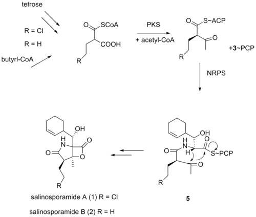 - ^ a b Beer LL; Moore BS (2007). "Biosynthetic convergence of salinosporamides A and B in the marine actinomycete Salinispora tropica". Org. Lett. 9 (5): 845–8. doi:10.1021/ol063102o. PMID 17274624.