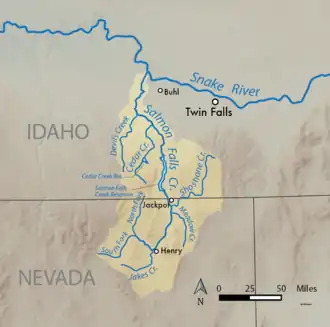 Salmon Falls Creek is a tributary of the Snake River, flowing from northern Nevada into Idaho in the United States. Formed in high mountains at the northern edge of the Great Basin, Salmon Falls Creek flows northwards 121 miles (195 km),[3] draining an arid and mountainous basin of 2,103 square miles (5,450 km2). The Salmon Falls Creek valley served as a trade route between the Native American groups of the Snake River Plain and Great Basin. Today, most of its water is used for irrigation.