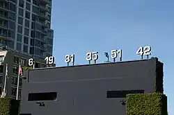 On April 15, 1997, exactly 50 years after Jackie Robinson broke the baseball color line, the No. 42 he wore with the Brooklyn Dodgers was retired throughout Major League Baseball.[23][12] Later that year, Randy Jones's No. 35 was retired by the Padres. He was a two-time All-Star (1975, 1976) and the club's first Cy Young Award winner in 1976.[28] On the day his number was retired, the Union-Tribune wrote that Jones was "the most popular athlete in the history of this city" during the mid-1970s.[29] Dave Winfield was next to have his number, 31, retired in 2001, when he was also inducted into the Baseball Hall of Fame. His retirement ceremony also celebrated his decision to be the first member of the Hall of Fame to have his plaque depicting him wearing a Padres cap. Winfield played for six teams in his 22-year career, spending his first eight seasons in San Diego.[30][13] In 2004, the Padres retired No. 19 in honor of Gwynn, who is widely considered the greatest Padres player ever.[18][31] He played his entire 20-year career with San Diego and won an NL-record eight batting titles.[18] The most recent number to be retired was Trevor Hoffman's No. 51 in 2011. He had retired from playing after 2010, when he left the game as MLB's career leader in saves with 601, including 552 with the Padres.[32]