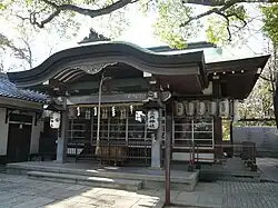 There is a statue of Sanada Yukimura on the grounds in recognition of the belief that the area is the location of the Sanada Maru, a fortification defended by the Toyotomi clan during the 1614 Winter Campaign of the Siege of Osaka. Within the grounds of the shrine is the opening of a tunnel, the "Sanada-no Nuke-ana" (真田の抜け穴), that is said to have connected the Sanada Maru to Osaka Castle during the siege.[2] The number of worshippers visiting the shrine has increased dramatically since the shrine has been featured in the 2016 NHK taiga drama Sanada Maru.[2] However, recent research by Yoshihiro Senda, Professor of Archeology and President of Nara University, concluded that the Sanada Maru was likely located several hundred metres away from the shrine.[3] Senda further found that the tunnel on the shrine's grounds is not the legendary passage, but more likely a trench dug by the attacking Maeda forces.