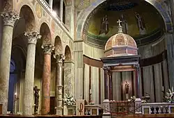 The church of Saint Agnes Outside the Walls (Italian: Sant'Agnese fuori le mura) is a titular church, a minor basilica in Rome, on a site sloping down from the Via Nomentana, which runs north-east out of the city, still under its ancient name.[1] What are said to be the remains of Saint Agnes are below the high altar. The church is built over the Catacombs of Saint Agnes, where the saint was originally buried, and which may still be visited from the church. A large basilica with the same name was built nearby in the 4th century and its ruins can be seen near Santa Costanza, in the same site. The existing church was built by Pope Honorius I in the 7th century, and largely retains its original structure, despite many changes to the decoration. In particular the mosaic in the apse of Agnes, Honorius, and another Pope is largely in its original condition. The current Cardinal Priest of the Titulus S. Agnetis Extra moenia is Camillo Ruini.[2]