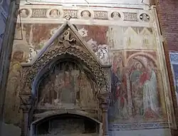 The main lunette has a representation of the Holy Trinity with the figures of St. Joseph and the Virgin Mary on either side. The Father is seated on a Gothic style throne with the crucifix between his knees and Christ at his side with a dove on his head. The figure is completed by a pair of angels above the Trinity. In the two smaller lunettes, the Bishop leads the people of Verona with the city's banner, and in the other, St. Peter the Martyr leads the friars with the black and white banner of the Dominicans.[31] These frescoes seem to be largely lost today, despite a not very successful retouching during the restoration of 1881;[32] the art historian Adolfo Venturi has recognized in these paintings the influence of the school of Stefano da Zevio, attributing them to some of his pupils.[33][34]