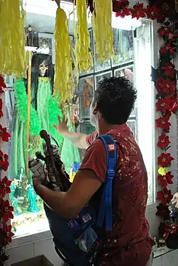 Shrines can also be found in the back of all kinds of stores and gas stations. As veneration of Santa Muerte becomes more accepted, stores specializing in religious articles, such as botánicas, are carrying more and more paraphernalia related to her worship. Historian R. Andrew Chesnut has discovered that many botanicas in both Mexico and the U.S. are kept in business by sales of Santa Muerte paraphernalia, with numerous shops earning up to half of their profits on Santa Muerte items.[36] This is true even of stores in very well known locations such as Pasaje Catedral behind the Mexico City Cathedral, which is mostly dedicated to stores selling Catholic liturgical items. Her image is a staple in esoterica shops.[12]