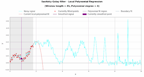 The Savitzy-Golay smoothing being applied, passing through the data from left to right in a moving window fashion. The red line represents the local polynomial being used to fit a subset of the data. From this, the smoothed values - shown as a purple line - are derived by evaluating the polynomial at the central point of the moving window.