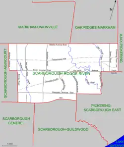 Scarborough—Rouge River was a federal electoral district in Ontario, Canada, that has been represented in the House of Commons of Canada between 1988 and 2015. However, as of the Fall 2015 federal election, part of this riding has been combined with the south-western part of the old riding Pickering—Scarborough East.