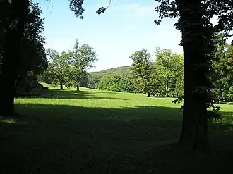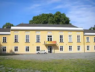 The palace was a nobleman's residence in the mid-17th century, but in the next century the building became known as Ricci'scher Freihof, after a merchant called Ricci who used it for cloth manufacture and silk dying.[1] The estate was bought by Countess Philippina von Herberstein toward the end of the 18th century. She began turning the grounds into a park, before selling to the banker Johann Heinrich Geymüller in 1797. He rebuilt the house as a palace, and had the gardens landscaped in a romantic English style, since when they have been considered some of Vienna's finest.[2] After Geymüller went bankrupt in 1841, the estate was auctioned, and had changed hands several times when the industrialist Max Schmidt purchased it in 1920. Since 1935 the palace and the surrounding 33 hectares of park have belonged to the city of Vienna and have been open to the public. When Roland Rainer modernised the building after the Second World War he removed many of the decorative features, both interior and exterior (including a set of impressive perrons at the front of the building) when a youth hostel was opened there. Today it houses the Vienna-Pötzleinsdorf Rudolf Steiner-Schule (a Steiner/Waldorf school).
