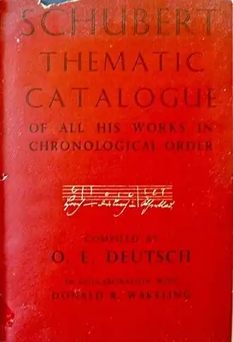 - Otto Erich Deutsch in collaboration with Donald R. Wakeling. Schubert: Thematic Catalogue of all his Works in Chronological Order. London: Dent — New York: W. W. Norton, 1951.