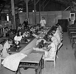 In 1948, Pierre Schunck (1906-1993), stemming from a family of weavers and son of the builder of the famous Glaspaleis in Heerlen, the Netherlands (see Schunck), arrived in Bonaire to set up a clothing industry (Kledingindustrie).[1] This clothing manufacturing would become Bonaire's first real industry, providing employment—and health care—for a large part of the young women who were left behind when many men had left as sailors or to work for the oil companies on Curaçao and Aruba. Preparations for the operation of this company would also result in better electricity and water supplies; eventually it would account for half the exports of the island.