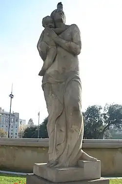| Motherhood | Vicenç Navarro | Stone | 2,73 x 0,92 x 1 | It is one of the figures located on the upper terrace, of those that originally were to be in the pavilion designed by Nebot for the square. When this project was cancelled, it was left as a free-standing sculpture, located on a pedestal and facing the mountain side of the square. It is an allegory of motherhood, represented by a woman with a naked torso and a tunic that covers her from the waist down, holding a child in her arms. This theme was fashionable at the time, generally related to conservatism, not in vain it was an official commission from institutions that emanated from the dictatorship of Primo de Rivera. Navarro made two other works for the square, Woman with Angel and The Night, although the latter was finally installed in the Parc de la Ciutadella.[19] | |