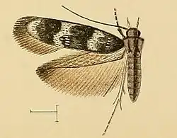 The wingspan is 7–10 mm. The forewings are black, with a few greyish white scales at the base and two greyish white transverse bands. The hindwings are dark leaden grey.[2]