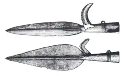 The bronzes found were technologically advanced for the time, including lost wax casting, and showed high degree of artist input in their design.[10] Horses were the most common shapes for the hilts of blades.[2] Weapons such as spearheads with hooks, single-bladed knives and socketed axes with geometric designs traveled west and east from Xinjiang.[11]