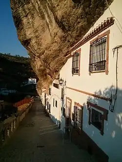 Setenil de las Bodegas is a pueblo (town) and municipality in the province of Cádiz, Spain, famous for its dwellings built into a rock that hangs above the Río Guadalporcún river. According to the 2005 census, the town has a population of 3,016 inhabitants.