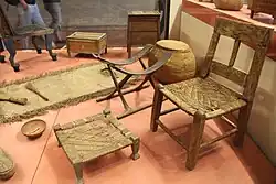 DM1159A is one of only three intact tombs discovered in Deir el-Medina.[11] Funerary bouquets of foliage were piled near the entrance of the chamber; others were placed at the rear of the chamber. At the back of the room, taking up nearly the entire width of the tomb, were the coffins of Sennefer and Nefertiti placed side by side. Sennefer's coffin was placed on a bier (funerary bed) and covered with a shroud; on the chest was a square cloth with a painted scene of him sitting before an offering table and inscribed with his name and title.[15][11] The coffin of the infant was placed in the space at the heads of the coffins. To the south, at the feet of the coffins, was a box with a pitched lid that supported a folding stool; both were once covered with a fabric shroud. Food offerings consisted of three plates of fruits, nuts and seeds, and two pottery vessels. A limestone ostraca with an offering table sketched in red ink was placed near the doorway.[15]
