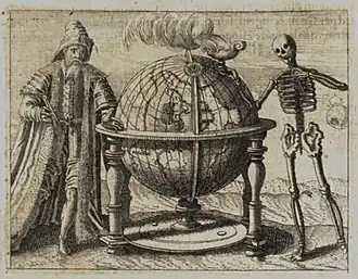 Salomon, Sheba, and Hiram of Tyre discuss the secrets of the universe. Over six days of the week, the seventh being Sabbath day, they investigate the nature of the universe from mineral to man. Under Vegetable Life the Rose is described. White and Red, the colours for Silver and Gold: "The center of the Rose is green- an emblem of the green Lion which philosophers know well."[2] The conference on man is illustrated with a print representing a globe in a frame, supported on the one side by a masculine figure with a compass, on the other by a skeleton holding a vase with smoking contents.[2]