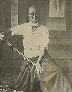 One of the most important sōke was the seventeenth, Ōe Masaji. Born in Asahi (nakasuka) Tosa in 1852, in his youth Ōe studied Kokuri-ryū and Oishi Shinkage-ryū (大石神影流)kenjutsu, along with Shimomura-ha Eishin-ryū (Musō Shinden Eishin-ryū:無雙神傳英信流).[7] At the age of 15 he took part in the Battle of Toba–Fushimi, following which he studied Tanimura-ha Eishin-ryū under Gotō Magobei.[7] He also studied Eishin-ryū bōjutsu under Itagaki Taisuke.[7] Ōe inherited leadership of the Tanimura-ha, becoming its 17th headmaster.[3][4] He combined the school's teachings with those of the Shimomura-ha[3] and restructured its curriculum. Ōe reduced the number of waza from around 160,[8] and reorganized them into the Seiza (Shoden), Tachihiza (Chūden), Okuiai (Okuden) and kumitachi waza sets practised today.[9] Although he retained the original techniques, he changed the names of some waza to aid understanding.[10] Ōe named the reorganised school Musō Jikiden Eishin-ryū,[10] during the Taishō era (1912-1926).[11] In 1900 he began teaching kendo and Eishin-ryū at the Kōchi branch of the Dai Nippon Butoku Kai and at local schools.[7] In 1924 he became the second person (after Nakayama Hakudō) to be awarded hanshi in iaidō by the Dai Nippon Butoku Kai.[7] Ōe died at Enokuchi on April 18, 1926. His many students went on to spread Musō Jikiden Eishin-ryū iai beyond Tosa and throughout Japan. 60 years after his death a memorial stone was raised to honour him on Mt Godaisan.