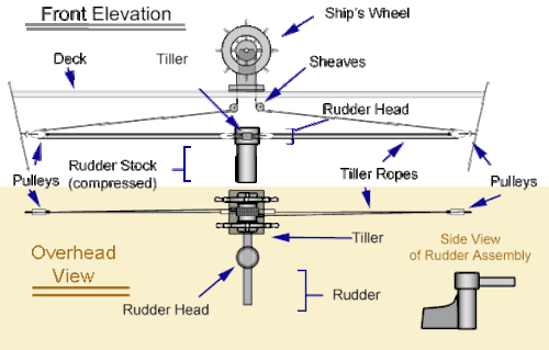 The steering gear of earlier ships' wheels sometimes consisted of a double wheel where each wheel was connected to the other with a wooden spindle that ran through a barrel or drum. The spindle was held up by two pedestals that rested on a wooden platform, often no more than a grate. A tiller rope or tiller chain (sometimes called a steering rope or steering chain) ran around the barrel in five or six loops and then down through two tiller rope/ chain slots at the top of the platform before connecting to two sheaves just below deck (one on either side of the ship's wheel) and thence out to a pair of pulleys before coming back together at the tiller and connecting to the ship's rudder. Movement of the wheels (which were connected and moved in unison) caused the tiller rope to wind in one of two directions and angled the tiller left or right. In a typical and intuitive arrangement, a forward-facing helmsman turning the wheel counterclockwise would cause the tiller to angle to starboard and therefore the rudder to swing to port causing the vessel to also turn to port (see animation).[3]: p.152 Having two wheels connected by an axle allowed two people to take the helm in severe weather when one person alone might not have had enough strength to control the ship's movements.