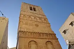 The north facade of the minaret is decorated with two rectangular commemorative plaques, contiguous just below the engraved calligraphy band. The right plate measures 49 cm high and 25 cm long, while the left, which is currently at risk of losing all its details, is 50 cm high and 25 cm long. The texts of nine lines each are written with a partially punctuated Tunisian style. Apart from these plates, the facades are richly decorated with moldings, serrations and architectural elements.[3]