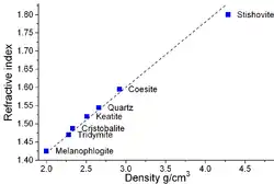 Alpha quartz is the most stable form of solid SiO2 at room temperature. The high-temperature minerals, cristobalite and tridymite, have both lower densities and indices of refraction than quartz. The transformation from α-quartz to beta-quartz takes place abruptly at 573 °C. Since the transformation is accompanied by a significant change in volume, it can easily induce fracturing of ceramics or rocks passing through this temperature limit.[13] The high-pressure minerals, seifertite, stishovite, and coesite, though, have higher densities and indices of refraction than quartz.[14] Stishovite has a rutile-like structure where silicon is 6-coordinate. The density of stishovite is 4.287 g/cm3, which compares to α-quartz, the densest of the low-pressure forms, which has a density of 2.648 g/cm3.[15] The difference in density can be ascribed to the increase in coordination as the six shortest Si–O bond lengths in stishovite (four Si–O bond lengths of 176 pm and two others of 181 pm) are greater than the Si–O bond length (161 pm) in α-quartz.[16] The change in the coordination increases the ionicity of the Si–O bond.[17]
