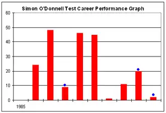 He recovered with treatment to return to the Australian One-Day team in the 1988–89 season and played 43 more limited-overs matches till 10 December 1991 and claimed 56 wickets and made 5 match winning 50 plus scores including the fastest half-century in One Day Internationals (18 balls v Sri Lanka, Sharjah, 1990, which lasted for 6 years until Sri Lankan Sanath Jayasuriya scored 50 from 17 balls v Pakistan at Singapore on 7 April 1996).[4] O'Donnell maintained a very good batting strike rate of 80.96 runs per 100 balls in ODIs, almost double his scoring rate in Tests.