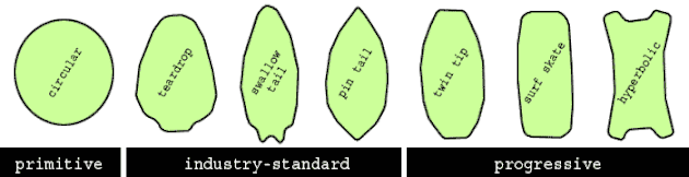 There are two basic sides of the spectrum for board types. The “Trick board,” a board where both sides are symmetrical and the shape is even throughout. This makes it ideal for spinning the board and completing tricks due to its symmetry. The “Cruiser board,” a board where the shape follows the same curves as a surfboard and is either slightly pointed or rounded at the top or tip and the back is slightly rounder. The backside of the board can also have a tail. These boards are typically called pintails.