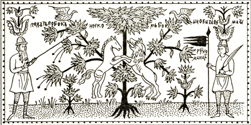 This carol contains three elements: the first one is two pigeons sitting on an oak tree, the second one is the catching of sand and stones by birds, the third is the creation of the world. Two pigeons, birds, hens or bees sitting in the crown of the tree is a popular motif among the Slavs – it represents the World Tree. In folklore, the World Tree stands in the "navel of the world", it is supposed to be heavy, tall and with a wide leaf. In a similar preserved myth, God throws his staff into the water, which then changes into a tree. On its branch, God and the Devil sit down to take the world out of the water. The relationship of this prayer with the World Egg is indicated by the "fine sand" from which the "black earth" and the "blue stones" from which the heaven and the celestial objects are made. This corresponds to the widespread myths of the Cosmic Egg, which is broken down in the creative act, and from whose lower shell the Earth is formed, and from whose upper shell the Heavens are formed.[9]