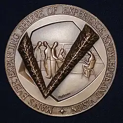 Although the official date of establishment was 1930, there was a public notice for the organization in the January 1929 edition of The Numismatist, the journal of the American Numismatic Association.[1] The notice also stated that, "The Society of Medalists had its inception at the convention of the American Federation of Arts in Washington last May" (May 1928).[1] The notice further stated, "The organization committee is composed of George D. Pratt, Robert W. DeForest and Alexander B. Trowbridge", however, later documents attributed the founding entirely to Pratt.[1] Additionally, the notice discussed that, "Exceptionally accurate machinery makes it possible to strike medals to the quantity of 1,000 or more for very low cost."[1]