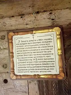 At the end of World War II, the church was closed, most of the icons disappeared.[6] Only two images of the Virgin and the icon of St. Nicholas survived. Also successfully preserve the frames of the vicar icons of the XVIII century, the royal gates, candlesticks, ark. Services in the church resumed only in 1990, when locals began to improve it somewhat. This stopped in 1997 when a new Greek Catholic church was built next to the monument.[7]