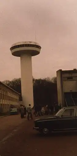 Solar Observatory Tower Meudon is a 36.47 metre tall tower built of reinforced concrete on the area of Meudon Observatory in Meudon, France, which has in its interior a spectrograph for examination of the sun. Solar Observatory Tower Meudon was built in 1964-65, and is a solar tower, a type of solar telescope. It has a shaft diameter of 6.6 metres. In a height of 30.57 metres it has an observatory floor with 18.4 metre diameter. The shaft of the tower consists of two concrete tubes which are separated by a 10 centimetre wide air spelt, in order to avoid wind induced vibrations.