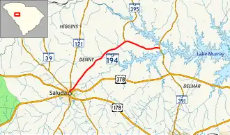 South Carolina Highway 194 (SC 194) is a 14.690-mile-long (23.641 km) state highway in the U.S. state of South Carolina. The highway connects Saluda and rural areas of Saluda County.