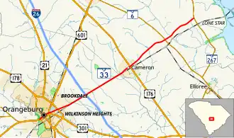 SC 33 begins at an intersection with US 301/US 601/SC 4 (John C. Calhoun Drive) in Orangeburg within Orangeburg. Here, the highway continues as Andrew Dibble Street. It travels to the northeast and immediately passes Veterans Memorial Park. A few blocks later, it intersects US 178 Bus. (Broughton Street). It cuts through Memorial Park. On the southwestern corner of South Carolina State University is an intersection with US 21 Bus./US 601 (Magnolia Street). The highway travels along the southeastern edge of the university. It begins traveling along the Wilkinson Heights–Brookdale line. The highway then intersects US 21/US 178 (Chestnut Street/Whittaker Parkway). After leaving the city area, SC 33 travels through rural areas of the county, has an interchange with Interstate 26 (I-26), and passes the Bull Swamp Cemetery. Just before entering Cameron, it enters Calhoun County. In town, it intersects US 176 (Old State Road). The highway resumes a rural routing, including an intersection with SC 6, until it meets its northern terminus, an intersection with SC 267, near Lone Star.