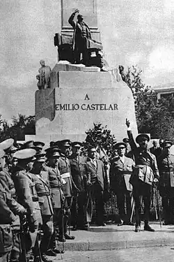 Political vision as to how the post-coup Spain would look like was confused and vague.[145] This was partially the result of political divisions within the officer corps, e.g. some conspirators were fiercely monarchist (Kindelán, Orgaz) and some were fiercely republican (Mola, Goded).[146] Ambiguity resulted also from the corporative military perception that it was the political class which by pursuing party interests brought the country to the brink of disaster,[147] and hence, that political declarations should be scaled to a minimum; the rising was to be "for Spain", with no specific political goal.[148] This was the reason why military conspirators were determined not to make any political commitments when speaking e.g. to the Falangists or the Carlists.[149] This, on the other hand, would soon not prevent key rebels - like Mola, Franco, or Queipo - from flying the republican tri-color flag and ending their radio broadcasts or manifestos with "¡Viva la República!".[150]
