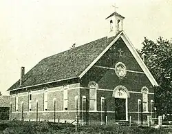 In 1895 St. Joseph church (left) was built just south of the railroad tracks on the east side of the highway, and the parish was divided at Jackson Street.[2]: 23 St. Joseph closed in 1956, to the dismay of some in its close-knit community.