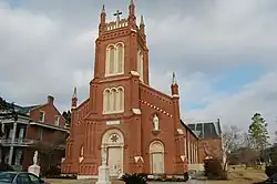 - St. Michael's Church (c. 1875), a cruciform basilica with a tower in Gothic Revival and Romanesque styles. It has a "five bay, aisled nave, and a massive altar set in a great niche whose back wall is cut through with a colonnade screen. The church is entered through a vestibule set in the base in a single central tower. In the ornate nave, multishaft columns rise to foliated capitals which support sets of Romanesque double arches. The exposed truss roof features King posts and foliated hanging pendants. The building is constructed of brick laid up in common bond. The exterior features the verticality, pinnacles, buttresses, and multiple arches of the Gothic style. Yet the numerous semicircular arches and blind arcading are Romanesque. Despite the mixture of styles, the blend is entirely harmonious and elegant. At one time there was an octagonal spire; however, it was blown down in the 1975 hurricane."[2]