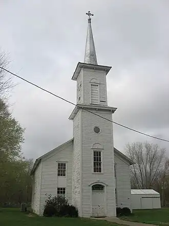 The wood-frame church features a limestone foundation, upper-story windows topped by lunettes, and a double entrance topped by an arched transom. The interior features an intricately carved wooden altar and pulpit, also designed by Fettinger. Construction was completed in 1860, and the building was dedicated in 1861. The church's bell tower, which is topped by a spire, was added in 1889, and the Queen Anne style parsonage was constructed in the 1900s.