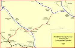 The Stafford and Uttoxeter Railway was authorised by an act of Parliament on 29 July 1862,[1] to build a line between the towns of Stafford and Uttoxeter in Staffordshire, England. It opened for traffic in 1867. It opened on 23 December 1867. Construction cost had much exceeded estimates, and income was poor, so that the company was always in financial difficulty. It was placed in receivership in 1875. The Great Northern Railway (GNR) had running powers to Uttoxeter and was persuaded to acquire the company, which it did in 1881. The GNR spent a considerable sum on improving the line, but it never made money and it was closed to passengers on 4 December 1939. Goods traffic ceased in 1951, except for a short stub to RAF Stafford; this too closed in 1975.