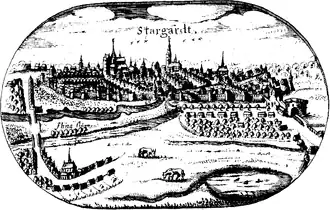 Stargard was part of the Duchy of Pomerania until its dissolution after the death of the last duke Bogislaw XIV in 1637.[7] During the Thirty Years' War the city was captured by Sweden in 1630.[9] It was besieged by the troops of the Holy Roman Empire in 1635,[11] and in order to hamper the attacks the Swedish commander set fire to the suburbs, causing a city fire, however, it was still captured by imperial troops.[12] In 1636 it was recaptured by the Swedes, then it was taken and plundered by Imperial troops to fall back to the Swedes again after the Battle of Wittstock.[13] In 1637 it was again captured by Imperial troops and then by Sweden.[13] As a result of the war, the population decreased by about 75%.[14]