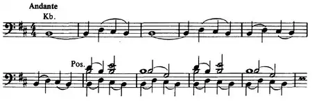 The slow introduction evokes the River Volga, quoting "The Song of the Volga Boatmen," with the song's solemnity coloring not only the B minor introduction but also the outer sections of the main Allegro con brio in the same musical key. These outer sections depict Razin's raids on villages along the river. A gentler central section (Allegro moderato) features a contrasting clarinet melody in the major a semitone lower and was claimed to be of Persian origin;[5] this theme, sensual and undulating in Russian orientalist fashion,[6] portrays the princess. The two themes, singly and in conjunction, provide the substance for the central development section, culminating in the graphic depiction of the princess's death. "The Song of the Volga Boatmen" is reprised in the brass to bring the work to a rousing conclusion.[1][4]