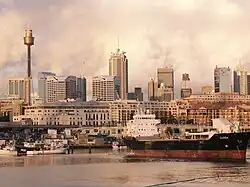 There was a wharf for unloading 'blue metal', Berth No.8, at the south-western corner of Woolloomooloo Bay, by 1907.[27] During the 1930s, Blue Metal and Gravel Company Pty Ltd had discharge hoppers at Woolloomooloo and 'blue metal' was unloaded there.[15]