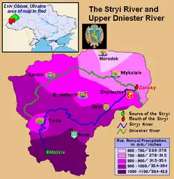 Map of the Stryi River with Raion Administrative cities indicated by their respective coats of arms | |