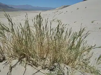 The only known species is Swallenia alexandrae, known by the common names Eureka dunegrass[4] and Eureka Valley dune grass. This genus was named for American botanist Jason Richard Swallen (1903-1991). The species was named for American philanthropist and paleontological collector Annie Montague Alexander.[5]