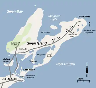 Swan Island (Wathaurong: Woorang-a'look)[1] is a 1.4 km2 sand barrier island which, with Duck Island and the Edwards Point spit, separate Swan Bay from Port Phillip in Victoria, Australia. It lies close to and north of the town of Queenscliff at the eastern end of the Bellarine Peninsula, and is an official bounded locality of the Borough of Queenscliffe.