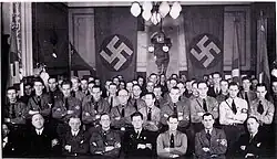 The party was modeled after the National Socialist German Workers Party (NSDAP).[2] As National Leader, Furugård had full authority of all party affairs (mimicking the role of the Führer in the German party).[2][3] Sven Olov Lindholm was the second-in-command in the party and the editor of Vår Kamp.[4] Furugård's two older brothers, Sigurd and Gunnar, also occupied key posts in the party leadership.[5] There was a nine-member Party Staff, which had an advisory function towards the National Leader. Each of the nine had a specific task in the party hierarchy;