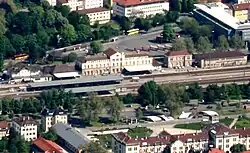 The line now forming the Plochingen–Immendingen railway, then called the Obere Neckarbahn (Upper Neckar Railway), was opened from Plochingen to Reutlingen in 1859. It was extended to Tübingen and Rottenburg am Neckar in 1861. The line was then further extended in several stages until 1870, when it finally reached Immendingen on the Black Forest Railway, connecting to Lake Constance. This provided the rail link to the capital of the former Kingdom of Württemberg for the then 8,000 residents of Tübingen and about 30,000 residents in the administrative district of Oberamt Tübingen that then included Tübingen. In 1861/1862, the still preserved station building was built to a design by the architect Josef Schlierholz. At the same time an engine depot was established in Tübingen. From 1867 to 1874, the Royal Württemberg State Railways built the Hohenzollern Railway (Hohenzollernbahn or Hohenzollern Railway, later called the Zollernalbbahn or Zollernalb Railway) from Tübingen via Hechingen to Sigmaringen, forming the Tübingen–Sigmaringen railway and making Tübingen into a railway junction. Once the Ammer Valley Railway from Herrenberg was connected to Tübingen on 1 May 1910, the present form of the rail junction was largely achieved. In 1916, an underpass was built to the two island platforms,[3] the entrance building was extended to the west with the construction of the so-called exit hall,[4] the interior of the entrance building was rebuilt and the platforms were covered.[5] Apart from changes of use, in particular the conversion of waiting rooms and storage areas to shops and restaurants, and minor changes, such as the removal of the platform barriers, it is largely unchanged since then.[6]
