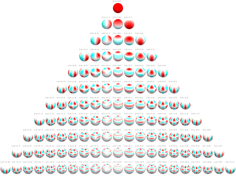 Below the real spherical harmonics are represented on 2D plots with the azimuthal angle, , on the horizontal axis and the polar angle, , on the vertical axis. The saturation of the color at any point represents the magnitude of the spherical harmonic. Positive values are red and negative values are teal.