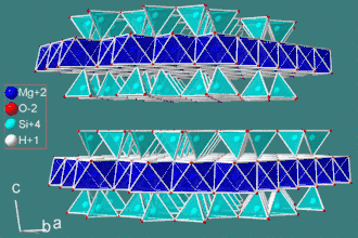 View of trioctahedral sheet of talc. Yellow spheres are hydroxyl; blue are magnesium. Apical oxygen binding sites are white. -