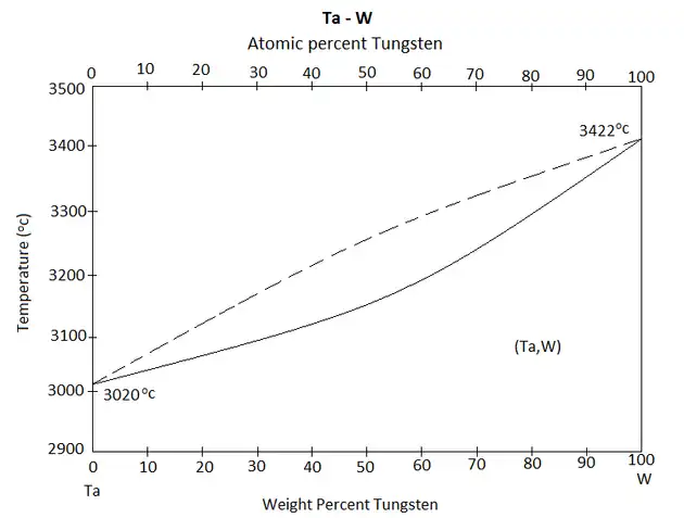 Tantalum–tungsten alloys are in the refractory metals group that maintain useful physical and chemical properties even at high temperatures. The tantalum–tungsten alloys are characterized by their high melting points and the tension resistance. The properties of the final alloy are a combination of properties from the two elements: tungsten, the element with the highest melting point in the periodic table, and tantalum which has high corrosion resistance.[1][2]